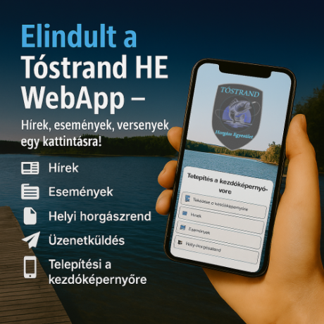 A Tóstrand Horgász Egyesületnek elkészült és elindult a hivatalos Tóstrand HE WebApp alkalmazása, amely modern, mobilbarát formában teszi elérhetővé az egyesület legfontosabb információit. Az új alkalmazás telepíthető Android és iOS eszközökre, és közvetlenül a kezdőképernyőről indítható, mintha csak egy natív app lenne. A WebApp célja, hogy minden horgász és érdeklődő gyorsan és kényelmesen hozzáférjen a legfrissebb hírekhez, eseményekhez, versenynaptárhoz, valamint a helyi horgászrendhez.