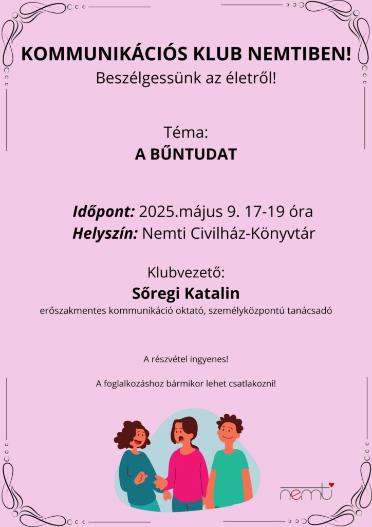 A közelmúltban egy új programsorozat kezdődött Nemtiben, a kommunikációs klub foglalkozásain minden alkalommal izgalmas téma kerül terítékre. Legközelebb május 9-én, pénteken a Civilházban találkoznak az érdeklődők, ahol 17 órától a bűntudatról lesz szó. Az ingyenes foglalkozás vezetője ezúttal is Sőregi Katalin, erőszakmentes kommunikáció oktató lesz.