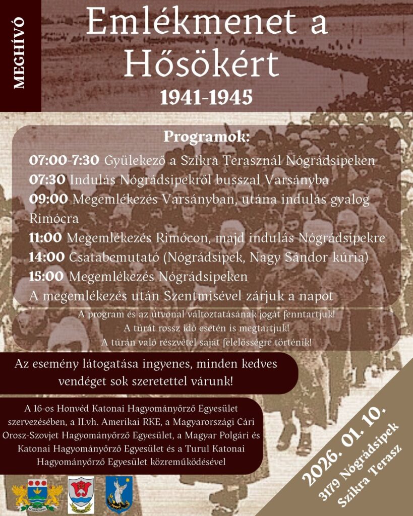 A Don-kanyarban vívott harcok hősire emlékeznek január 10-én, szombaton Nyugat-Nógrádban. Az emlékmenet Nógrádsipeket, Varsányt és Rimócot is érinti. Nógrádsipek önkormányzata a Facebook-oldalán adta hírül, hogy Rimóc és Varsány önkormányzatával közösen január 10-én, szombaton emlékmenettel és megemlékezésekkel tisztelegnek a Don-kanyar hőseinek emléke előtt.