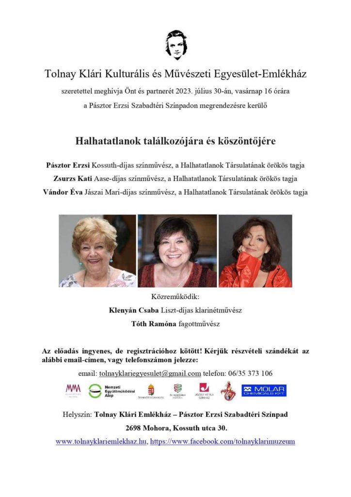 A Halhatatlanok Társulatának három örökös tagját is köszöntik majd Mohorán július 30-án, vasárnap 16 órakor. A Tolnay Klári Kulturális és Művészeti Egyesület – Emlékház szervezésében megvalósuló program során a Pásztor Erzsi szabadtéri színpadon Pásztor Erzsi, Zsurzs Kati és Vándor Éva találkozik, és foglal helyet. Az esemény színvonalát Klenyán Csaba Liszt-díjas klarinétművész és Tóth Ramóna fagottművész emeli tovább játékával. Az előadás ingyenes, de regisztrációhoz kötött.