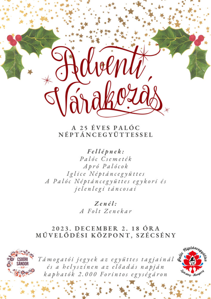 A 25 éves Palóc Néptáncegyüttes – Szécsényi Népművészeti Egyesület közösségi oldalán adta hírül, hogy december 2-án, szombaton 18 órától ismét megrendezik az Adventi várakozás című hagyományos évzáró folklórműsorukat a szécsényi Művelődési Központban.