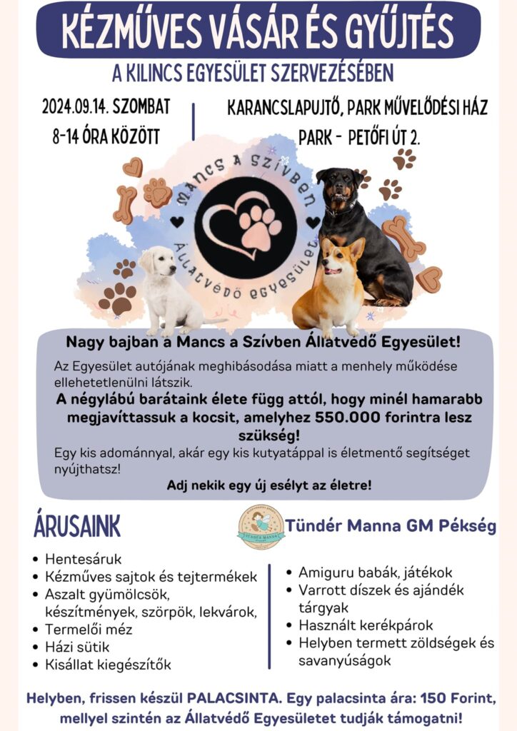 A kézműves vásár mellett adománygyűjtést is tartanak a salgótarjáni Mancs a Szívben Állatvédő Egyesület számára, ugyanis a szervezet autójának meghibásodása miatt a menhely működése ellehetetlenülni látszik. Mint a felhívásban is írták: a kutyusok élete függ attól, hogy minél hamarabb megjavíttassák az autót, amelyhez 550 ezer forintra van szükség.