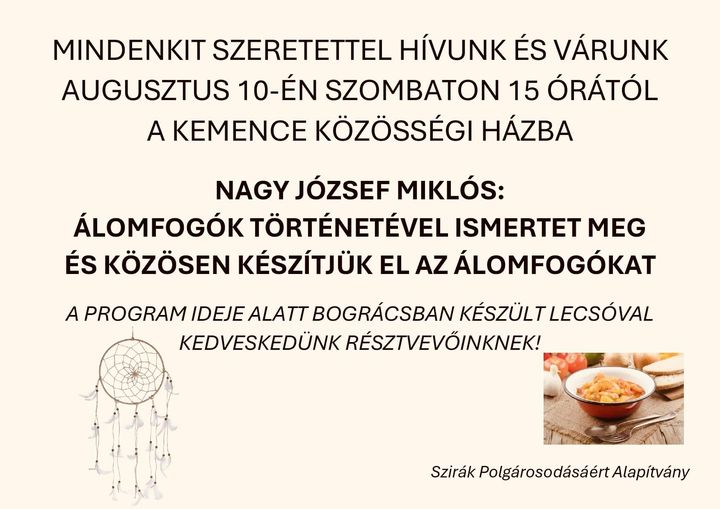 Izgalmas előadással várják a helyieket a településen. Az érdeklődőknek Nagy József Miklós tart majd előadást az álomfogók történetéről. A résztvevők emellett közösen elkészíthetik majd a saját álomfogójukat is. A program ideje alatt bográcsban készült lecsóval várják a látogatókat. A rendezvény a Szirák Polgárosodásáért Alapítvány szervezésében valósul meg.