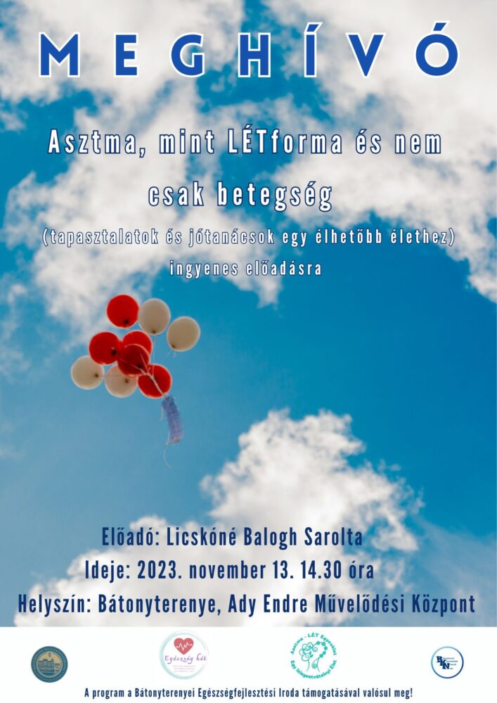 Asztma, mint létforma és nem csak betegség címmel tart előadást Licskóné Balogh Sarolta, az Asztma-LÉT Egyesület elnöke november 13-án, hétfőn 14.30 órától Bátonyterenyén az Ady Endre Művelődési Központban. A program az egészséghét eseménysorozat egyik állomásaként valósul meg, annak során tapasztalatok és tanácsok hangzanak el az élhetőbb mindennapokhoz. Az előadás a Bátonyterenyei Egészségfejlesztési Iroda támogatásával valósul meg, így ingyenesen látogatható.