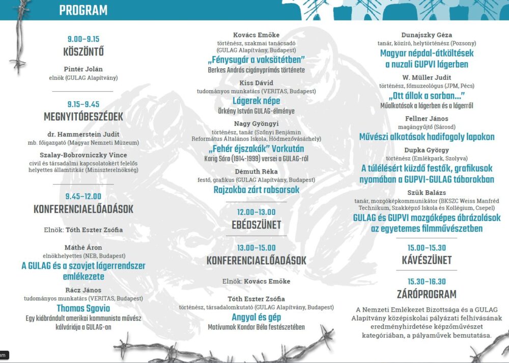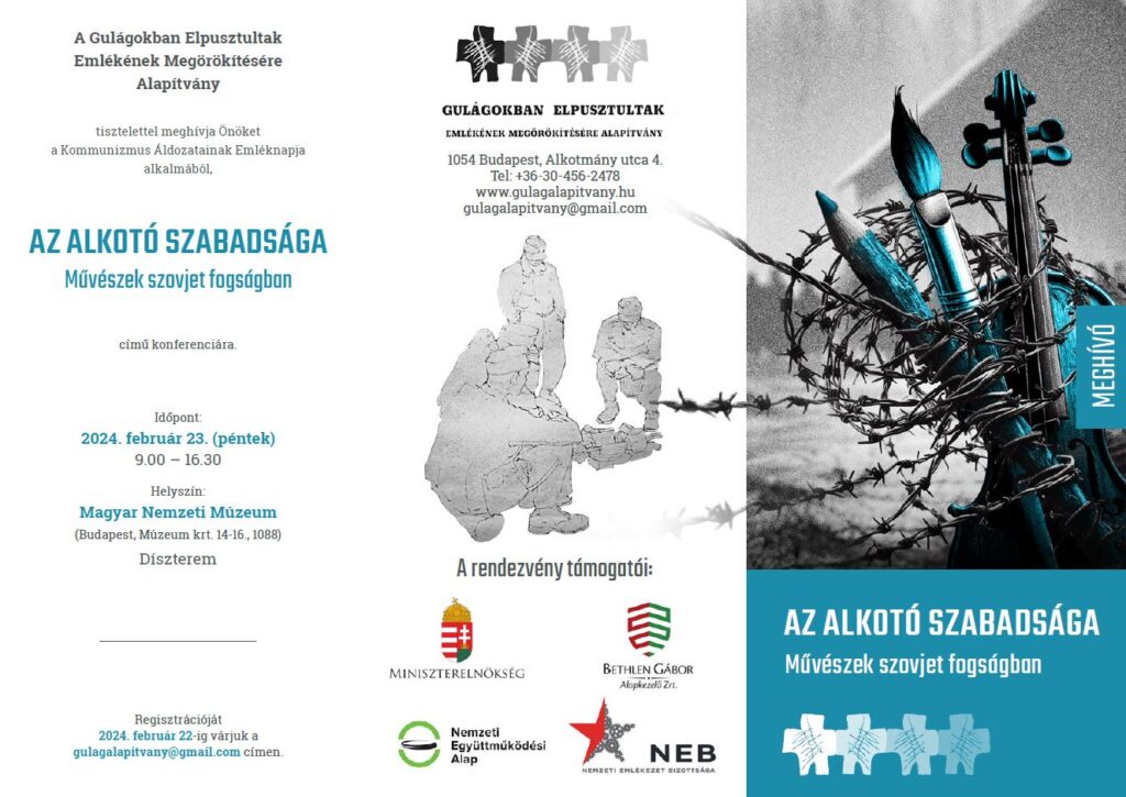 A Gulágokban Elpusztultak Emlékének Megörökítésére Alapítvány tisztelettel meghívja Önöket a Kommunizmus Áldozatainak Emléknapja alkalmából, AZ ALKOTÓ SZABADSÁGA- Művészek szovjet fogságban című konferenciára.