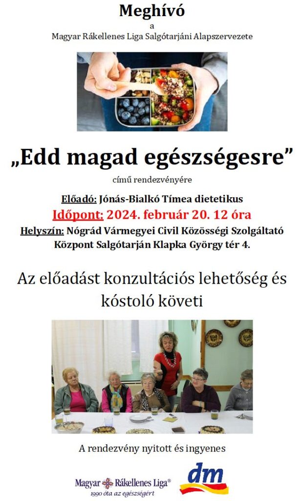 Az alapszervezet Facebook-oldalán elérhető tájékoztatás szerint az Edd magad egészségesre! című ingyenes és nyitott programnak a Nógrád Vármegyei Civil Közösségi Szolgáltató Központ ad majd otthont 12 órától. A Jónás-Bialkó Tímea dietetikus által tartott előadást kóstoló követi majd, valamint a résztvevők számára konzultációs lehetőséget is biztosítanak a szervezők.