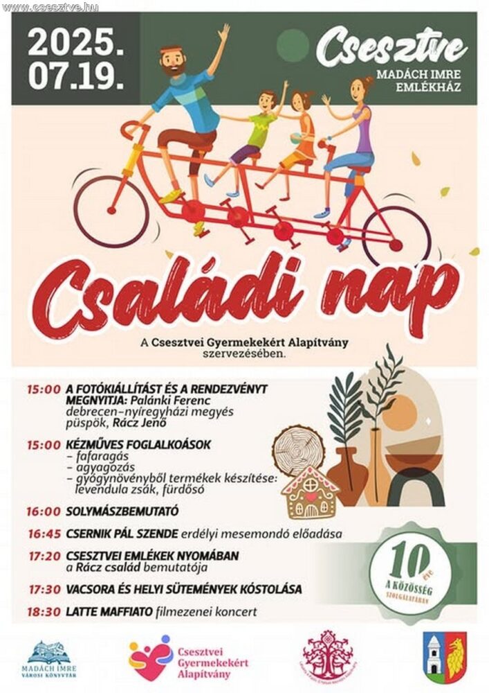 Július 19-én, szombaton családi napot tartanak a Csesztvei Gyermekekért Alapítvány szervezésében. Csesztve község honlapján elérhető tájékoztatás szerint Madách Imre Emlékházban 15 órakor Palánki Ferenc Debrecen-nyíregyházi megyés püspök, valamint Rácz Jenő restaurátor, református lelkész nyitja meg a rendezvényt és az ahhoz kapcsolódó fotókiállítást. Ezzel egy időben kézműves foglalkozások kezdődnek, így a látogatók kipróbálhatják a fafaragást, az agyagozást, de készíthetnek levendulazsákot és fürdősót is. Az érdeklődők solymászbemutatót tekinthetnek meg 16 órától, később Csernik Pál Szende erdélyi mesemondó repíti a képzelet szárnyán a megjelenteket. A csesztvei emlékek nyomába eredhetnek a résztvevők 17 óra 20 perctől a Rácz család bemutatójának köszönhetően, 10 perccel később vacsora és helyi sütemények kóstolása várja a látogatókat, majd a családi napot 18 óra 30 perctől a Latte Maffiato filmzenei koncertje zárja.