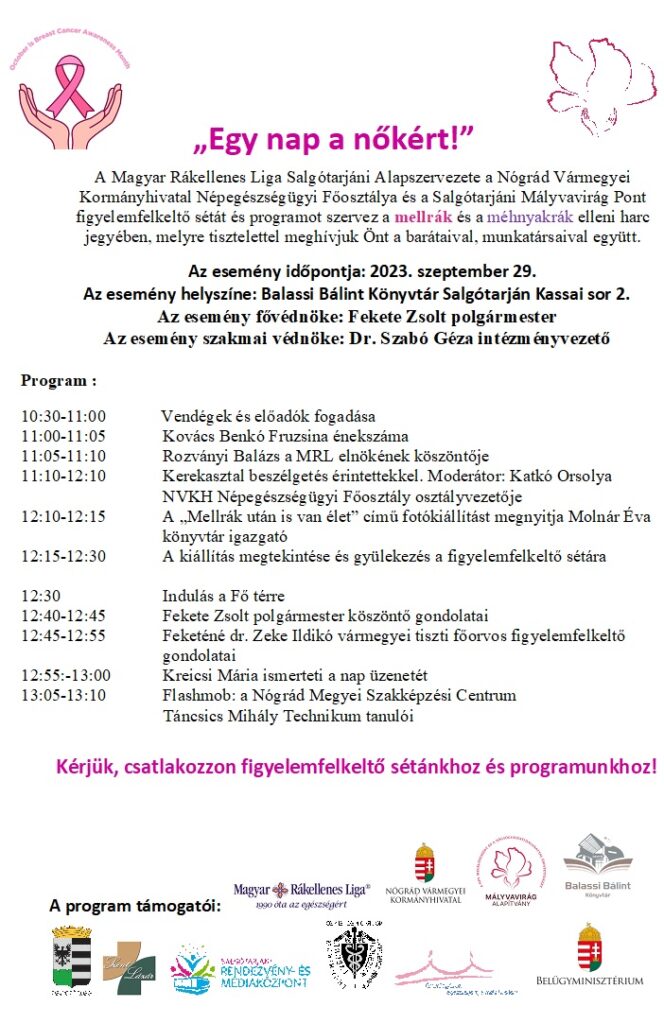 Az MRL Salgótarjáni Alapszervezete, a Nógrád Vármegyei Kormányhivatal (NVKH) Népegészségügyi Főosztálya és a Salgótarjáni Mályvavirág Pont által közösen szervezett „Egy nap a nőkért” című programnak a Balassi Bálint Könyvtár ad otthont. A látogatókat 11 órától Németh Anna, a Zenthe Ferenc Színház művésze kápráztatja el énekhangjával, azt követően pedig Rozványi Balázs, az MRL elnökének köszöntője hangzik el. Ezután érintettek osztják meg a megjelentekkel tapasztalataikat egy kerekasztal beszélgetés során, amelynek moderátori szerepét Katkó Orsolya, NVKH Népegészségügyi Főosztályának osztályvezetője tölti majd be.