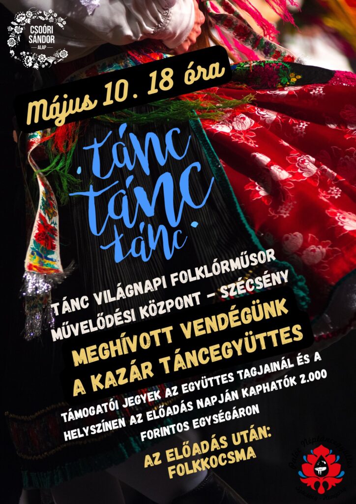 Műsorváltozás miatt új időpontban, május 10-én rendezik meg Szécsényben a tánc világnapja alkalmából szervezett folklórestet. A programot a Palóc Néptáncegyüttes és vendégei adják elő a szécsényi művelődési központ színháztermében. A rendezvény házigazdája a Palóc Néptáncegyüttes, valamint utánpótlás csapatai, az Apró Palócok és a Palóc Csemeték lesznek. A műsort a Folt Zenekar kíséri élő zenével, Lenkó Péter vezetésével.