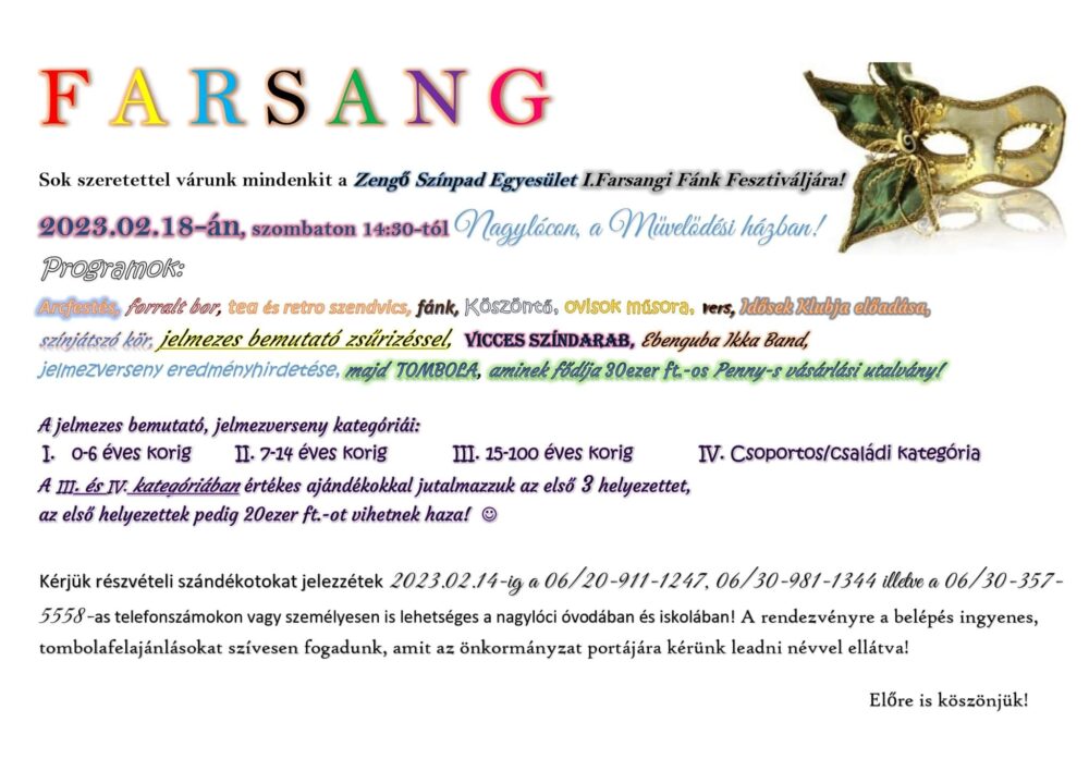 A Zengő Színpad Egyesület szervezésében I. Farsangi Fánk Fesztivált tartanak Nagylócon február 18-án, szombaton délután fél háromtól. A művelődési házban lesz arcfestés, forralt bor, tea és retro szendvics, fánk, színes kulturális műsorok, jelmezes felvonulás zsűrizéssel, majd tombolahúzás.