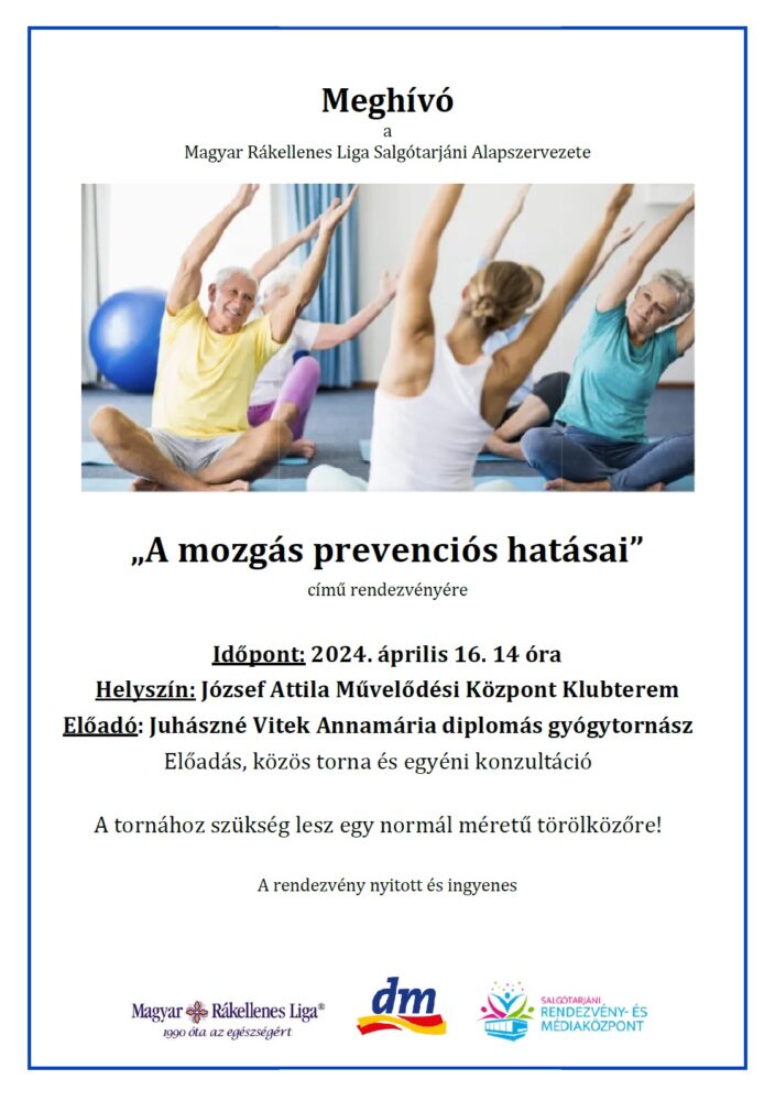 Mozgással egybekötve bővíthetik ismereteiket az érdeklődők a Magyar Rákellenes Liga Salgótarjáni Alapszervezetének programján április 16-án.  Az alapszervezet Facebook-oldalán megosztott tájékoztatásból az is kiderült, hogy „A mozgás prevenciós hatásai” című rendezvénynek a József Attila Művelődési Központ klubterme ad otthont kedden 14 órától.