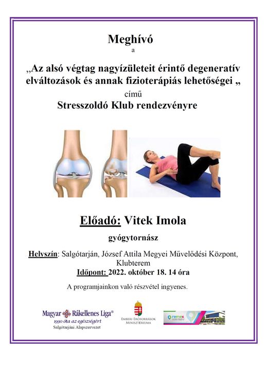 A Magyar Rákellenes Liga Salgótarjáni Alapszervezete október 18-án, kedden, 14 órától tartja a stresszoldó klub következő foglalkozását. A csoport közösségi oldalán megosztott tájékoztatás szerint az esemény során Vitek Imola gyógytornász tart előadást az alsó végtag nagy ízületeit érintő degeneratív elváltozásokkal és azok fizioterápiás lehetőségeivel kapcsolatban a József Attila Megyei Művelődési Központban.