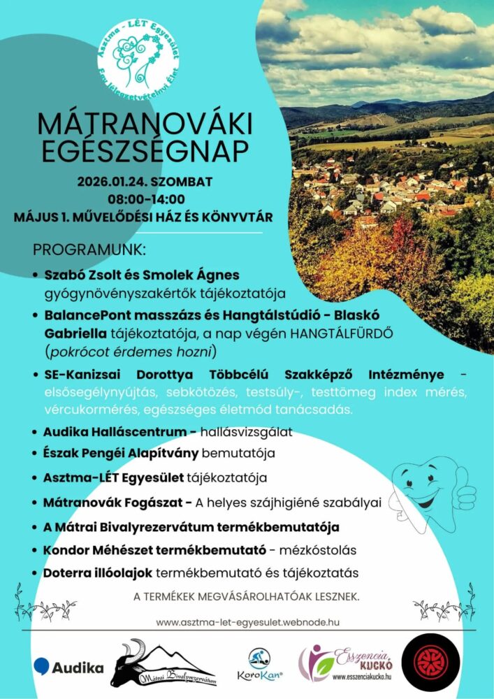 Egészségnapot tartanak Mátranovákon, szűrések és bemutatók színesítik a napot. Egészségnapot szervez a helyi Asztma-Lét Egyesület Mátranovákon január 24-én, szombaton 8-14 óráig. A művelődési házban Szabó Zsolt és Smolek Ágnes gyógynövényszakértők tájékoztatójával indul a program, majd a Kanizsai Dorottya egészségügyi iskola diákjai és oktatói tartanak bemutatót: az érdeklődők elsajátíthatják a sebkötözés, az elsősegélynyújtás alapjait, de lesz testsúly-, testtömegindex- és vércukormérés, egészséges életmód tanácsadás is. A nap folyamán tartanak hallásvizsgálatot, a résztvevők megismerhetik a helyes szájhigiéné szabályait és termékbemutatók is színesítik a napot, amelyet hangtálfürdő zár.