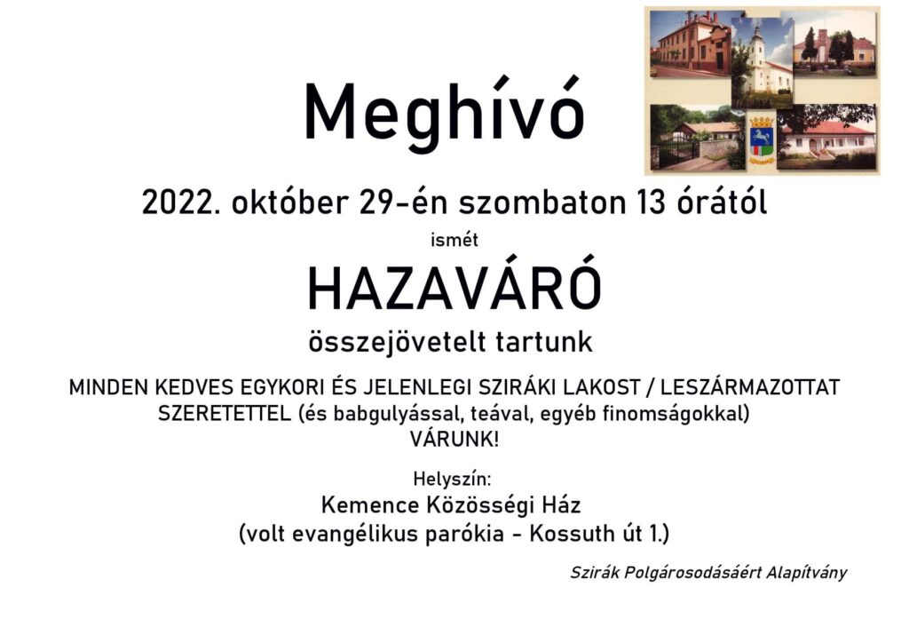 Hazaváró rendezvényt tart a településen október 29-én, szombaton 13 órától a Szirák Polgárosodásáért Alapítvány – közölte a szervezet közösségi oldalán.