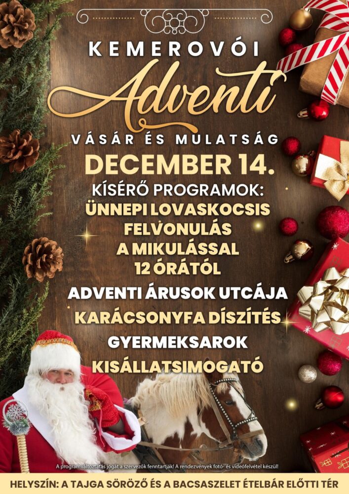 Szombaton rendezi meg a II. Kemerovói Adventi Vásárt és Mulatságot a Kertvárosért Egyesület. A legkisebbek már déltől találkozhatnak a Télapóval, aki lovaskocsin érkezik a rendezvényre. A kicsik fel is ülhetnek majd a kocsira, és néhány kör erejéig közösen utazhatnak a Mikulással. Szintén délben nyílik meg az adventi vásár, de lesz gyermeksarok, kisállatsimogató és közös karácsonyfa-díszítés is. A délután folyamán a Pilinyi Vegyeskar, Kalina Enikő énekesnő és Gonda László Príma-díjas zongoraművész, valamint Szabó Péter is fellépnek, 16 órától pedig egy meglepetés sztárvendég ad karácsonyi műsort. A zenés-táncos produkciókat tombolahúzás, majd utcabál követi.