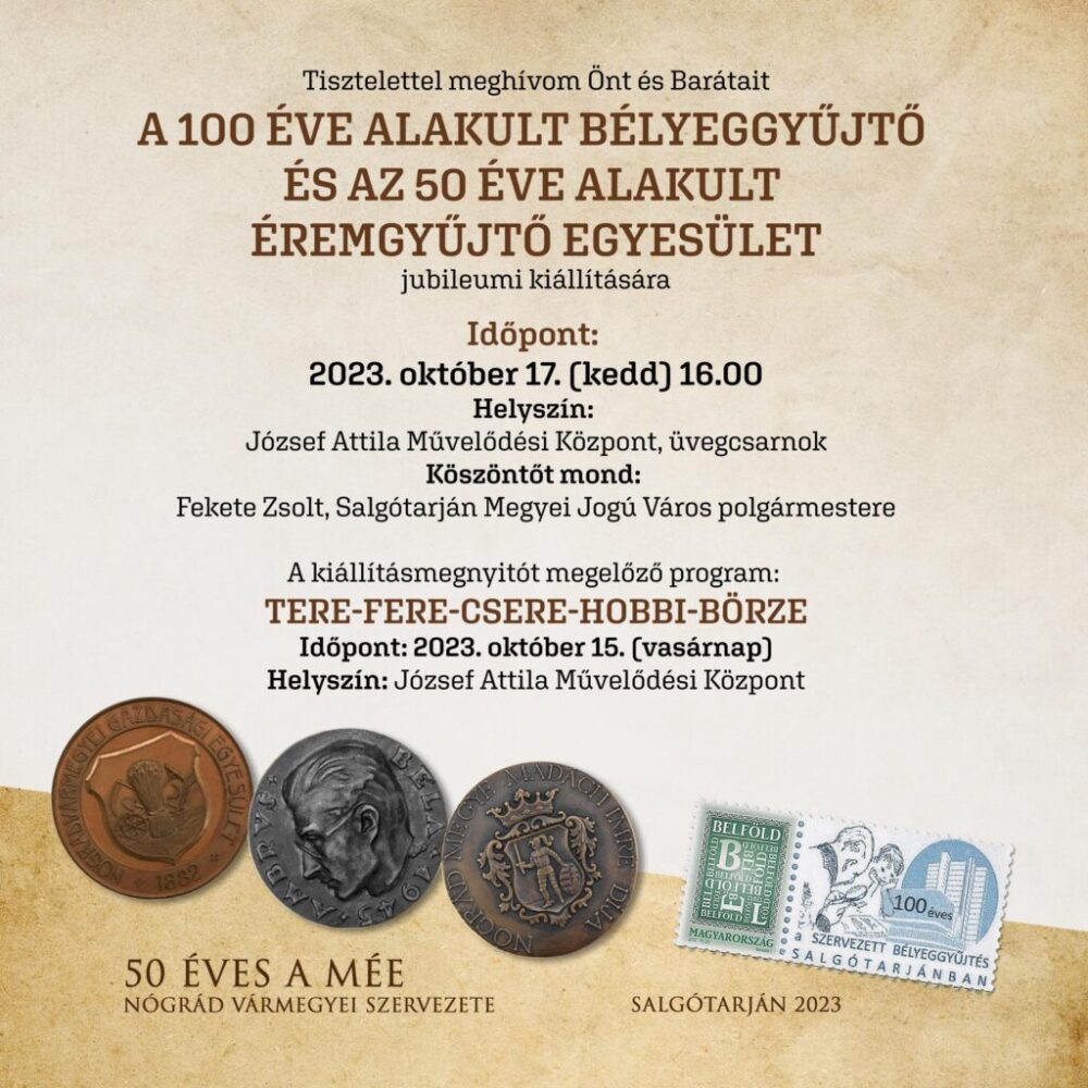 A kiállítással két kerek évfordulót is ünnepelnek: a salgótarjáni szervezett bélyeggyűjtés immár százéves, míg a Magyar Éremgyűjtők Egyesülete Nógrád Vármegyei Szervezete idén ötvenéves. A jubileumi tárlatot október 17-én, kedden 16 órakor nyitják meg a József Attila Művelődési Központ Üvegcsarnokában, köszöntőt mond Fekete Zsolt, Salgótarján polgármestere. A kiállítást ezt követően október 21-ig láthatja a közönség, minden nap 8 és 18 óra között.
