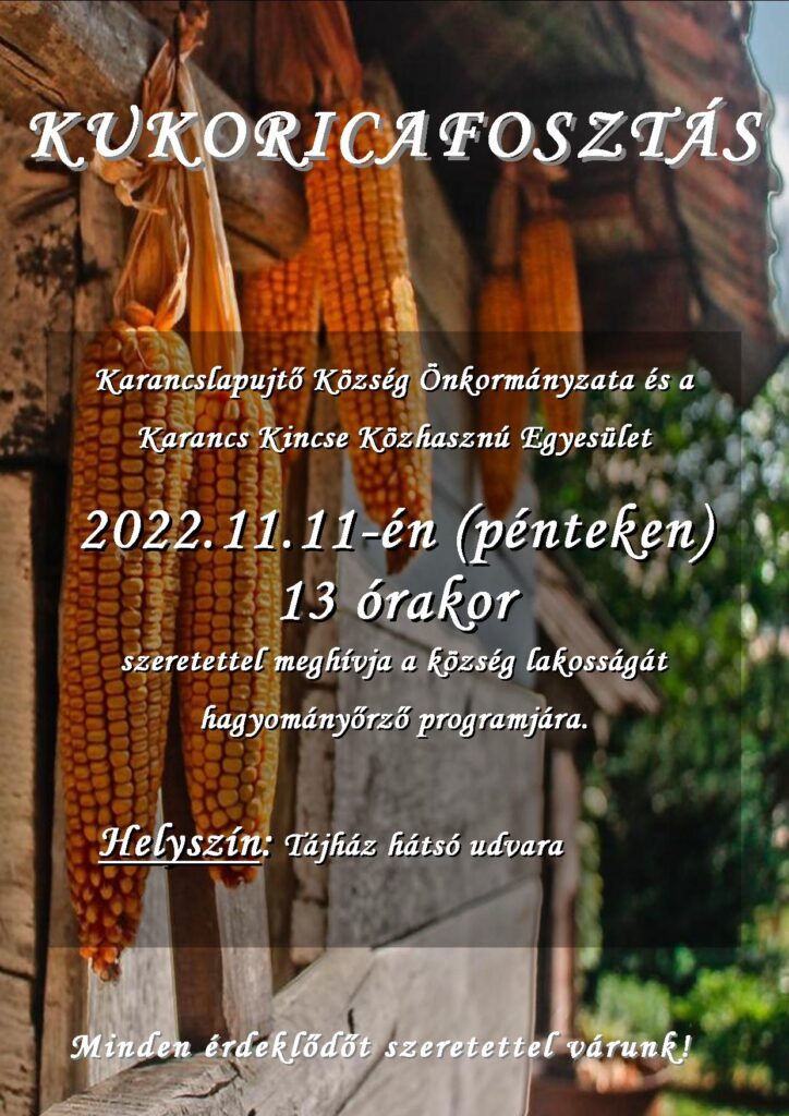 Kukoricafosztást tartanak a településen november 11-én, pénteken, 13 órakor – közölte a településvezetés közösségi oldalán. A hagyományőrző program az önkormányzat és a Karancs Kincse Közhasznú Egyesület szervezésében valósul meg. A rendezvénynek a tájház hátsó udvara ad majd otthont.