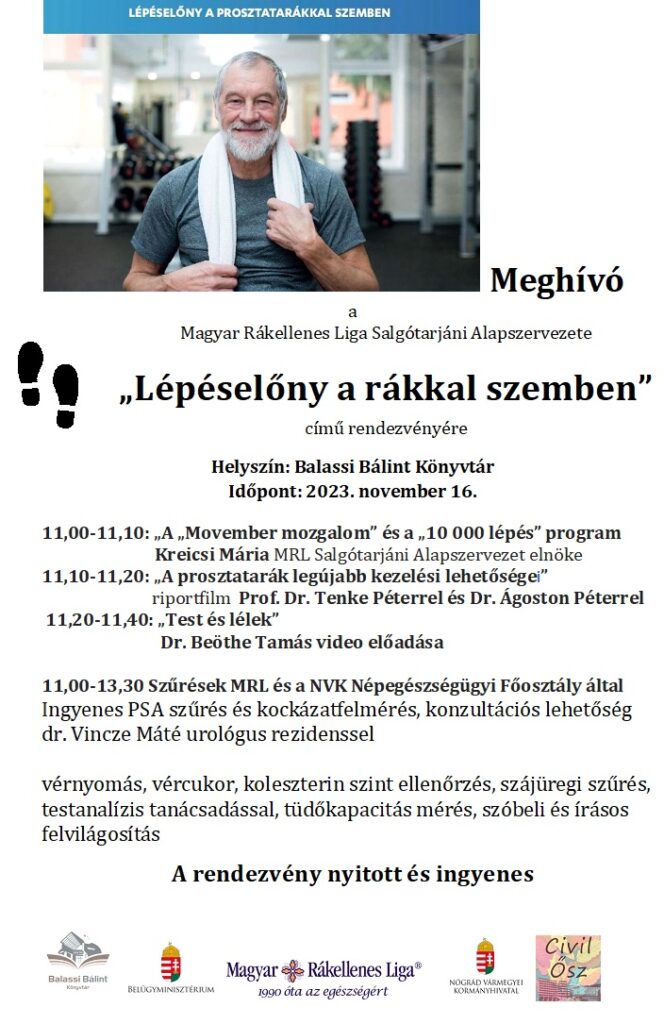 Ezt követően a prosztatarák legújabb kezelési lehetőségeiről tekinthetnek meg egy riportfilmet a résztvevők, akik ezután Dr. Beöthe Tamás Test és lélek című videó előadása nyomán hallhatnak a témával kapcsolatos érdekes információkat. Mindezzel párhuzamosan 11 órától az MRL Salgótarjáni Alapszervezete és a Nógrád Vármegyei Kormányhivatal Népegészségügyi Főosztálya ingyenes PSA szűrést, illetve kockázatfelmérést végez a helyszínen, ahol konzultációs lehetőség is rendelkezésre áll majd dr. Vincze Máté urológus rezidensnek köszönhetően. A nyitott és ingyenes rendezvényen a szervezők emellett vérnyomás-, vércukor- és koleszterinszint ellenőrzéssel, szájüregi szűréssel, testanalízis tanácsadással, tüdőkapacitás méréssel, hiteles szóbeli és írásbeli tájékoztatással várják az érdeklődőket.