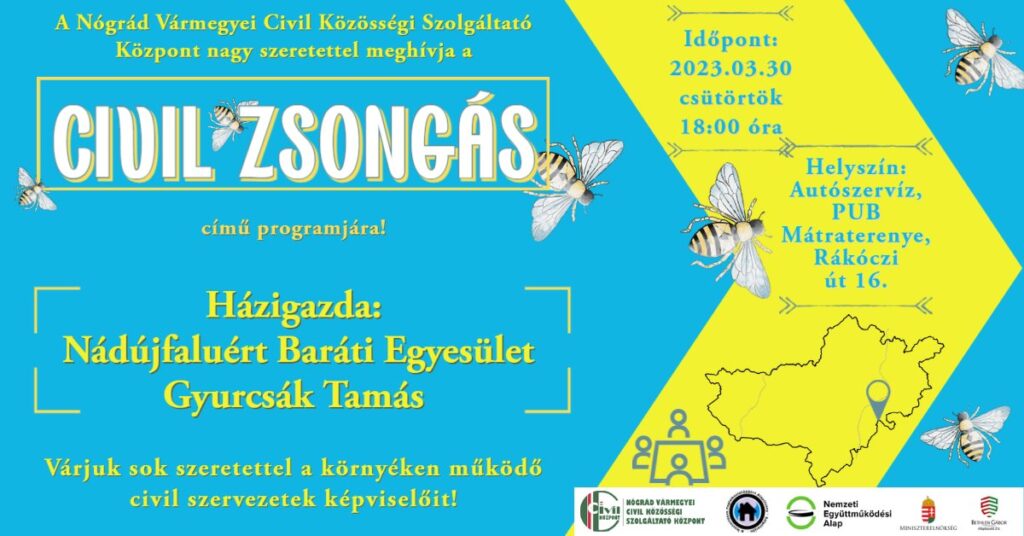 Civil zsongás címmel szervez programot a mátraterenyei Autószervíz Pub-ban a Nógrád Vármegyei Civil Közösségi Szolgáltató Központ március 30-án, csütörtökön 18 órától.