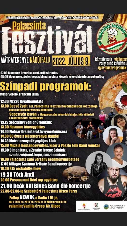 – A rekordkísérlet felállítása érdekében a Nógrád Megyei Civil Központnak köszönhetően több egyesület is összefog. Segítségünkre lesz a többszörös rekorder, Pokol Krisztián is. Az új csúcs várhatóan a 13 órás hivatalos megnyitóra már elkészül, és négyre bővíti a Mátraterenyén felállított palacsintarekordokat – mondta Gyurcsák Tamás. – Ekkor indul el a palacsintakészítő verseny, amelyre eddig csaknem 15 csapat nevezett be. A háromtagú szakmai zsűri elnöke Szó Gellért, díjnyertes cukrász lesz.