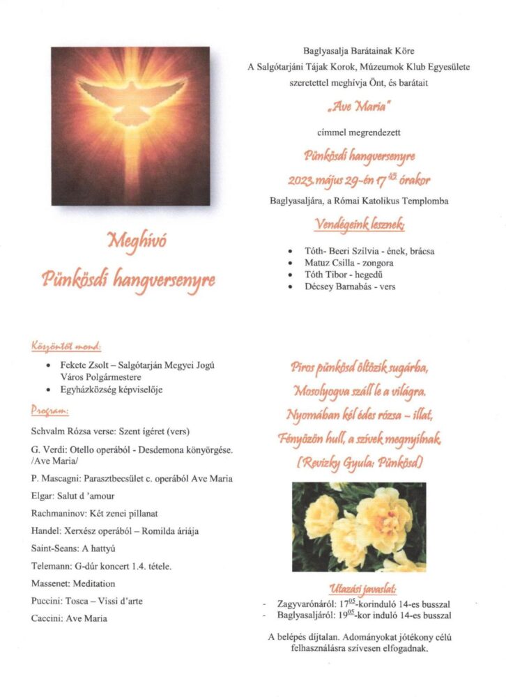 Már 1997 óta hagyomány, hogy pünkösdkor hangversenyt rendeznek a Salgótarjánhoz tartozó Baglyasalján, a Krisztus Király-templomban. Május 28-án, ma 17.45 órakor kezdődő koncert az Ave Maria címet viseli, szervezője a Salgótarjáni Tájak, Korok Múzeumok Klub Egyesület és Baglyasalja Barátainak Köre. A műsorban fellép Tóth-Beeri Szilvia, Matúz Csilla, Tóth Tibor és Décsey András.