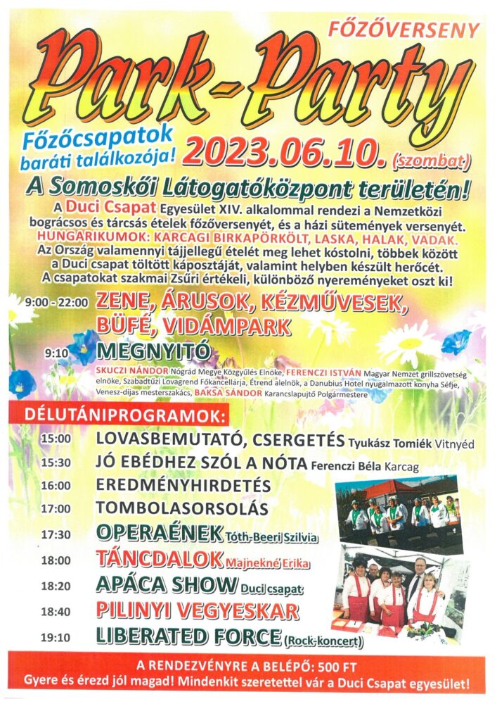 Egy igazi Park Party során tartanak baráti találkozót a főzőcsapatok a Somoskői Látogatóközpontban június 10-én, szombaton. A karancslapujtői Duci Csapat Egyesület immár tizennegyedik alkalommal rendezi meg a nemzetközi bográcsos és tárcsás ételek főzőversenyét, illetve a házi süteményekkel való megmérettetést. A csapatok által készített tájjellegű ételeket zsűri értékeli majd.