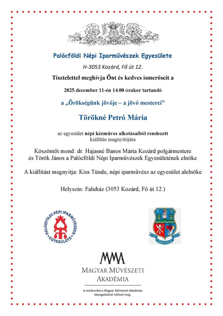 Megnyílik Kozárdon az Örökségünk jövője – a jövő mesterei című kiállítás, amely a népi kézműves alkotásokat mutatja majd be. A tárlat december 11-én, csütörtökön 14 órakor nyílik majd meg a helyi faluházban, ahol Törökné Petró Mária művész alkotásait tekinthetik meg az érdeklődők. A megnyitón köszöntőt mond dr. Hajasné Banos Márta, Kozárd polgármestere és Török János, a Palócföldi Népi Iparművészek Egyesületének elnöke. A kiállítást Kiss Tünde népi iparművész, az egyesület alelnöke nyitja majd meg. A rendezvényt a Magyar Művészeti Akadémia támogatja.