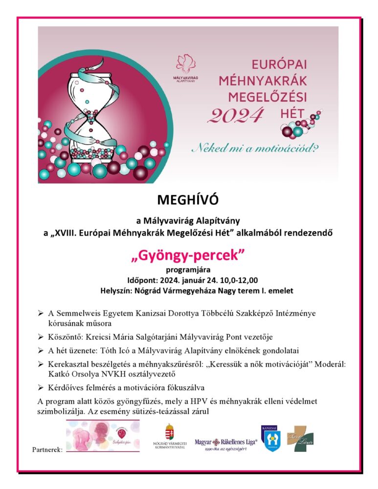 A XVIII. Európai Méhnyakrák Megelőzési Hét alkalmából január 24-én, szerdán 10 órától a „Gyöngy-percek” című programra várják az érdeklődőket a salgótarjáni vármegyeházán. Az eseményen a Salgótarjáni Mályvavirág Pont vezetője, Kreicsi Mária mond ünnepélyes köszöntőt, majd a Mályvavirág Alapítvány elnöke, Tóth Icó fejti ki gondolatait a XVIII. Európai Méhnyakrák Megelőzési Héttel kapcsolatban.