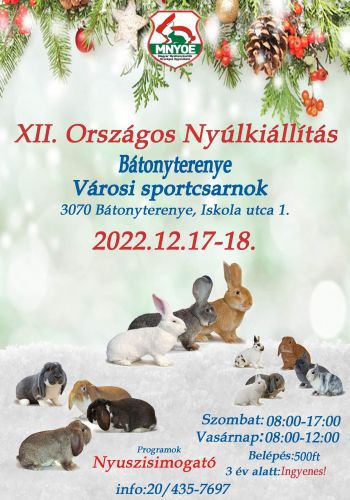 A Bátonyterenyei Sportcsarnok ad majd otthont a XII. Országos Nyúlkiállításnak december 17–18-án. A Magyar Nyúltenyésztők Országos Egyesülete által rendezett eseményen mindkét nap reggel 8 órától kezdődnek a programok, amelyek szombaton egészen 17 óráig, míg vasárnap délig tartanak majd.