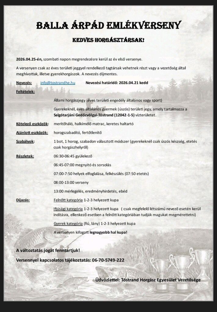 A Balla Árpád horgász emlékversenyt április 25-én, szombaton a salgótarjáni Tóstrandon bonyolítják le. A Tóstrand Horgász Egyesület emlékversenye reggel 7 órakor veszi kezdetét és egészen 13 óráig tart. A horgászok felnőtt, ifjúsági, és gyerek kategóriában mérettethetik meg magukat. A versenyen a legnagyobb halat kifogó pecásnak egy serleg lesz a jutalma.