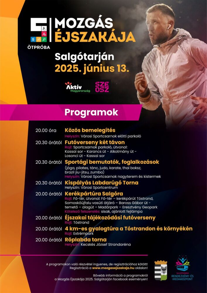 A Mozgás Éjszakája nemcsak sportesemény, hanem közösségi élmény is, ahol mindenki a saját tempójában mozoghat, kipróbálhat új mozgásformákat, miközben feltöltődhet a sport örömével. A szervezők mindenkit szeretettel várnak – legyen szó rutinos sportolókról, lelkes amatőrökről vagy épp most mozgásba lendülő családokról!