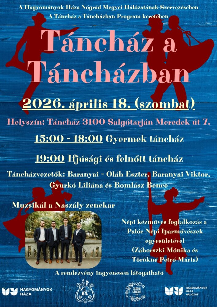 Salgótarján ezen a hétvégén sem hagyja unatkozni a helyieket: szombaton táncház lesz a Táncházban! A Nógrád Táncegyüttes közös mulatságra hívja az érdeklődőket, ahol a legkisebbektől a felnőttekig mindenki megtalálhatja a maga ritmusát – díjmentesen. Délután 15 órától 18 óráig gyermektáncházat tartanak, este 19 órától pedig az ifjúsági és felnőtt táncház veszi kezdetét, a jó hangulatról a Naszály zenekar gondoskodik.