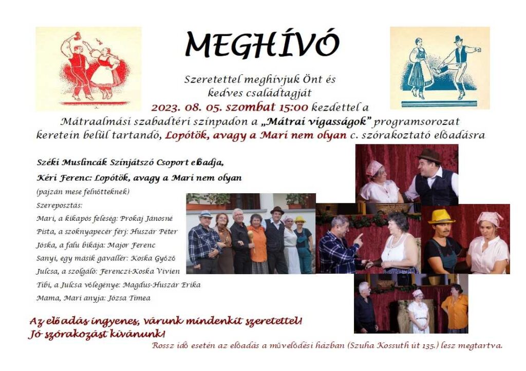 Immár negyedik alkalommal vehetnek részt az érdeklődők a Mátrai Vigasságok nevű programon augusztus 5-én, szombaton 15 órától Szuhán. A szervező szerepét ezúttal is a Mátra Barátainak Polgári Egyesülete tölti be. A megszokottól eltérően a látogatókra ez alkalommal nem táncház vár, ahelyett a mátraalmási falurész szabadtéri színpadán egy pajzán mesét tekinthetnek majd meg a Széki Muslincák Színjátszó Csoport előadásában. A Lopótök, avagy a Mari nem olyan című szórakoztató előadást elsősorban a felnőttek számára ajánlják a szervezők.