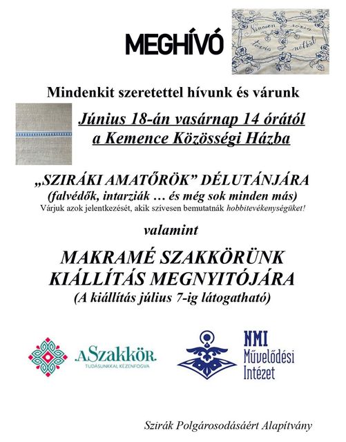 Sziráki amatőrök délutánja címmel nyílik kiállítás a településen június 18-án, vasárnap 14 órától – közölte a Szirák Polgárosodásáért Alapítvány közösségi oldalán. A rendezvényre látogatók a korábbi makramé szakkör alkotásait tekinthetik majd meg. A tárlatot az érdeklődők július 7-ig, péntekig csodálhatják meg, amelynek a Kemence Közösségi Ház ad otthont.