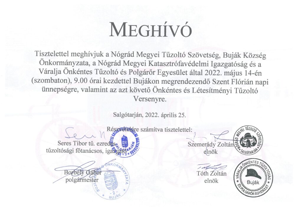 Szent Flórián tiszteletére ünnepséget tartanak, majd önkéntes és létesítményi tűzoltóversenyt a településen május 14-én, szombaton, 9 órától – közölte a helyi önkormányzat közösségi oldalán. A rendezvény a Nógrád Megyei Tűzoltó Szövetség, a Nógrád Megyei Katasztrófavédelmi Igazgatóság, a Váralja Önkéntes Tűzoltó és Polgárőr Egyesület, illetve az önkormányzat szervezésben valósul meg.